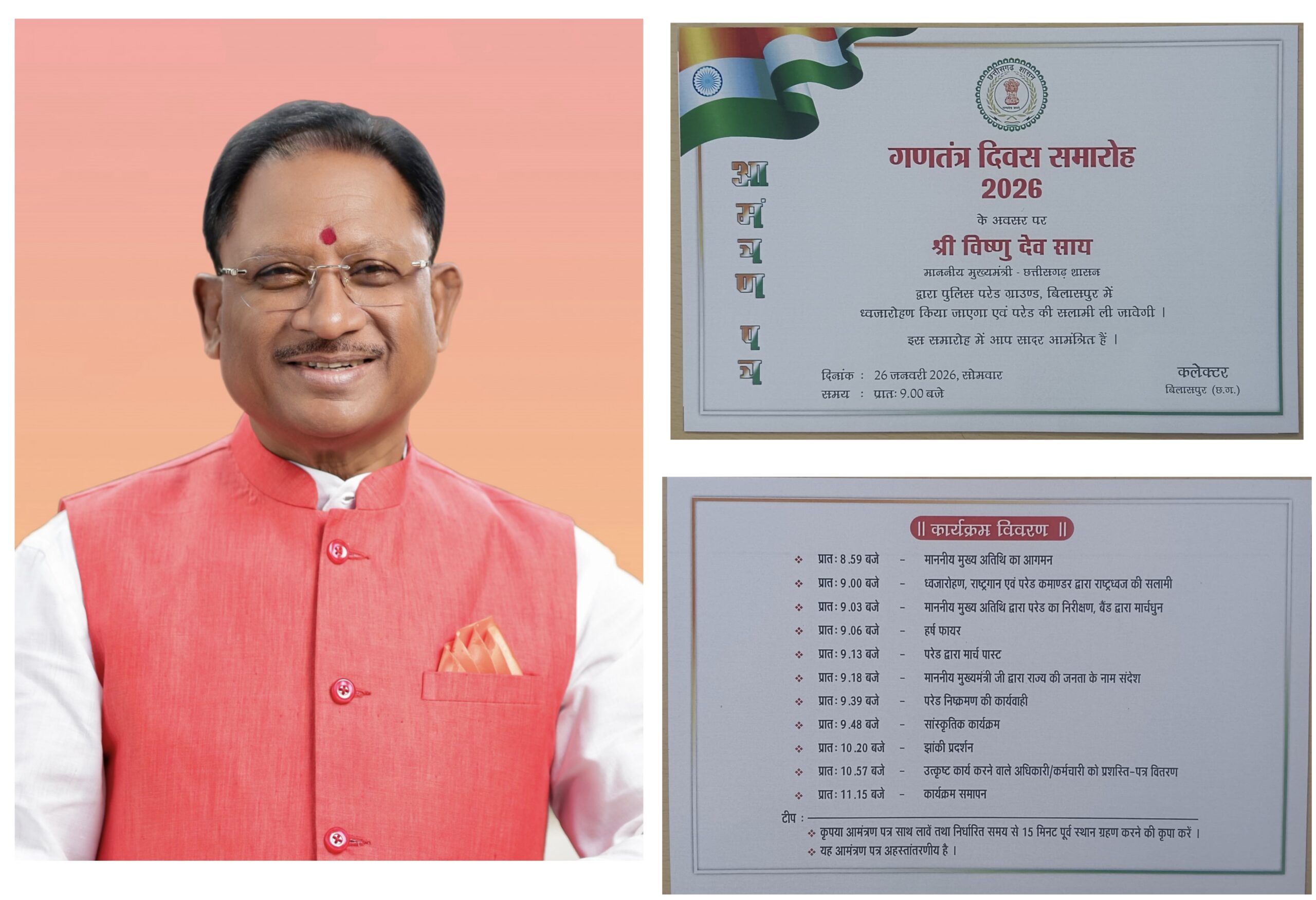 बिलासपुर:-मुख्यमंत्री श्री विष्णुदेव साय संभागीय मुख्यालय बिलासपुर के पुलिस परेड मैदान में आयोजित गणतंत्र दिवस के मुख्य समारोह में तिरंगा झंडा फहराएंगे। वे राज्य की जनता के नाम संदेश वाचन के साथ ही परेड की सलामी लेंगे। गणतंत्र दिवस समारोह आयोजन की तमाम तैयारियां जिला प्रशासन द्वारा पूर्ण कर ली गई हैं।