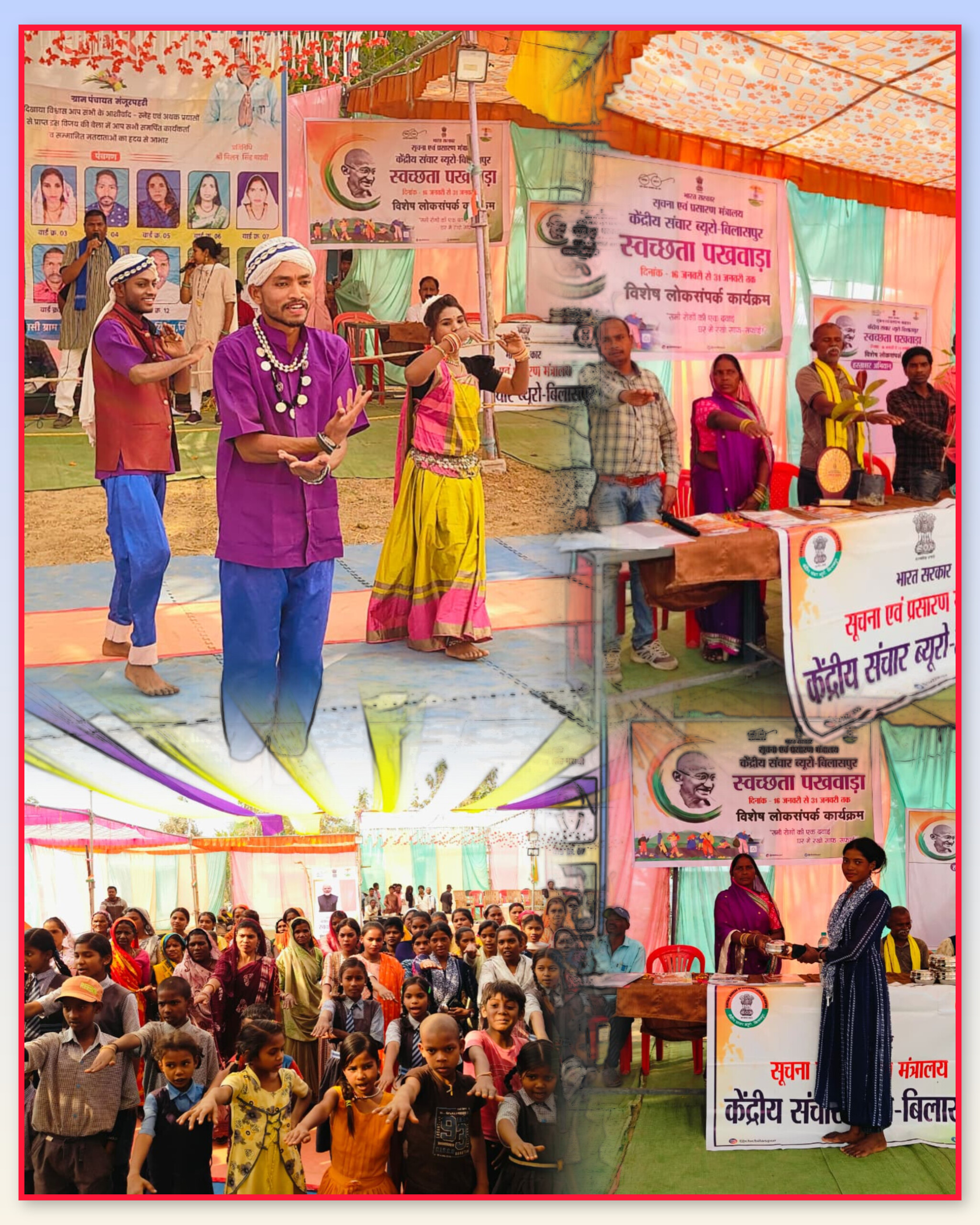 भारत सरकार के सूचना एवं प्रसारण मंत्रालय के अधीन केंद्रीय संचार ब्यूरो, बिलासपुर द्वारा स्वच्छता पखवाड़ा के अंतर्गत बिल्हा विकास खण्ड के आदिवासी आदर्श ग्राम मंजूरपहरी, जिला बिलासपुर में एक दिवसीय समेकित लोकसंपर्क कार्यक्रम का सफल आयोजन किया गया। कार्यक्रम का उद्देश्य स्वच्छता के प्रति जन-जागरूकता बढ़ाना तथा सामुदायिक सहभागिता को सुदृढ़ करना रहा।