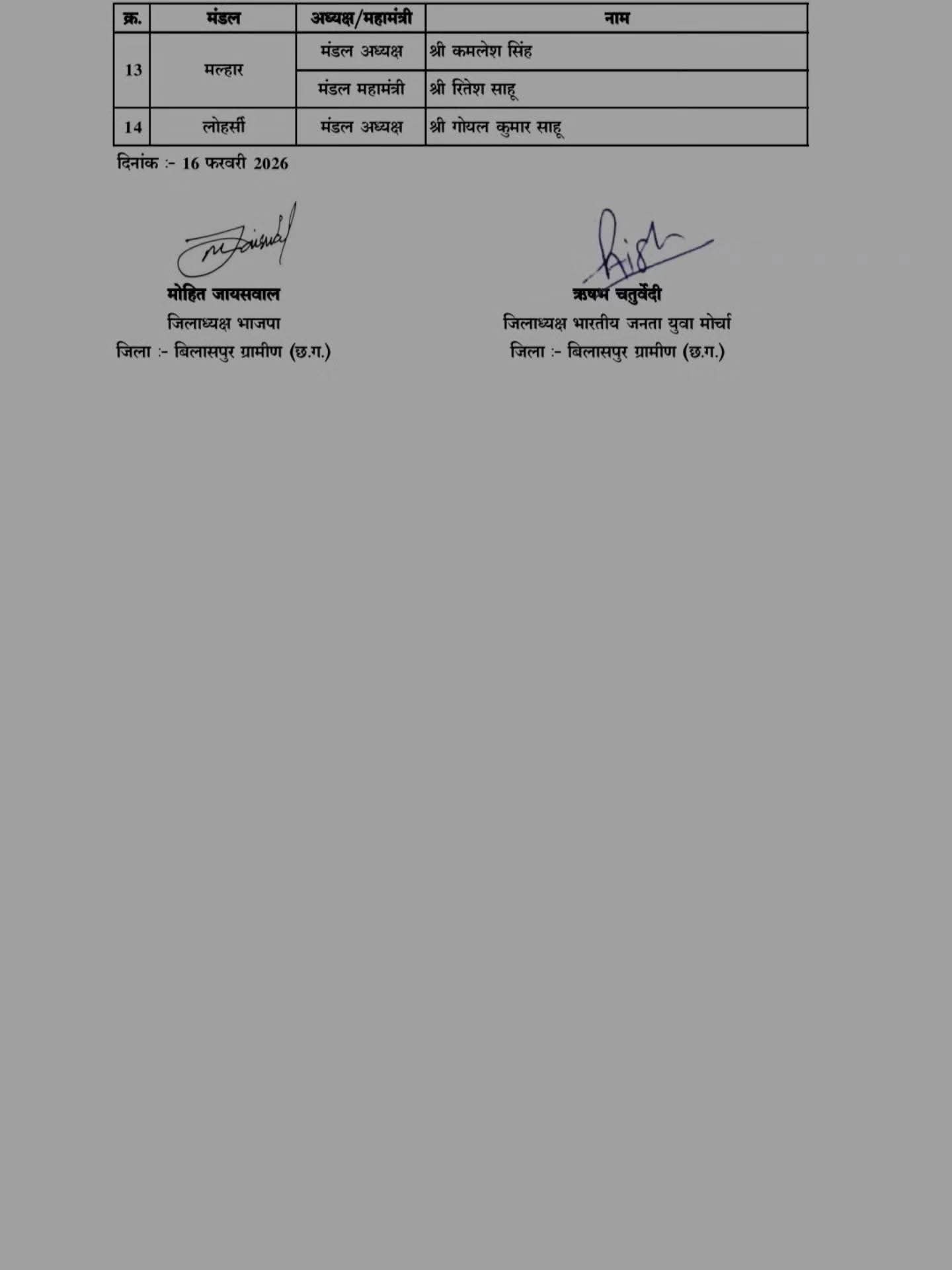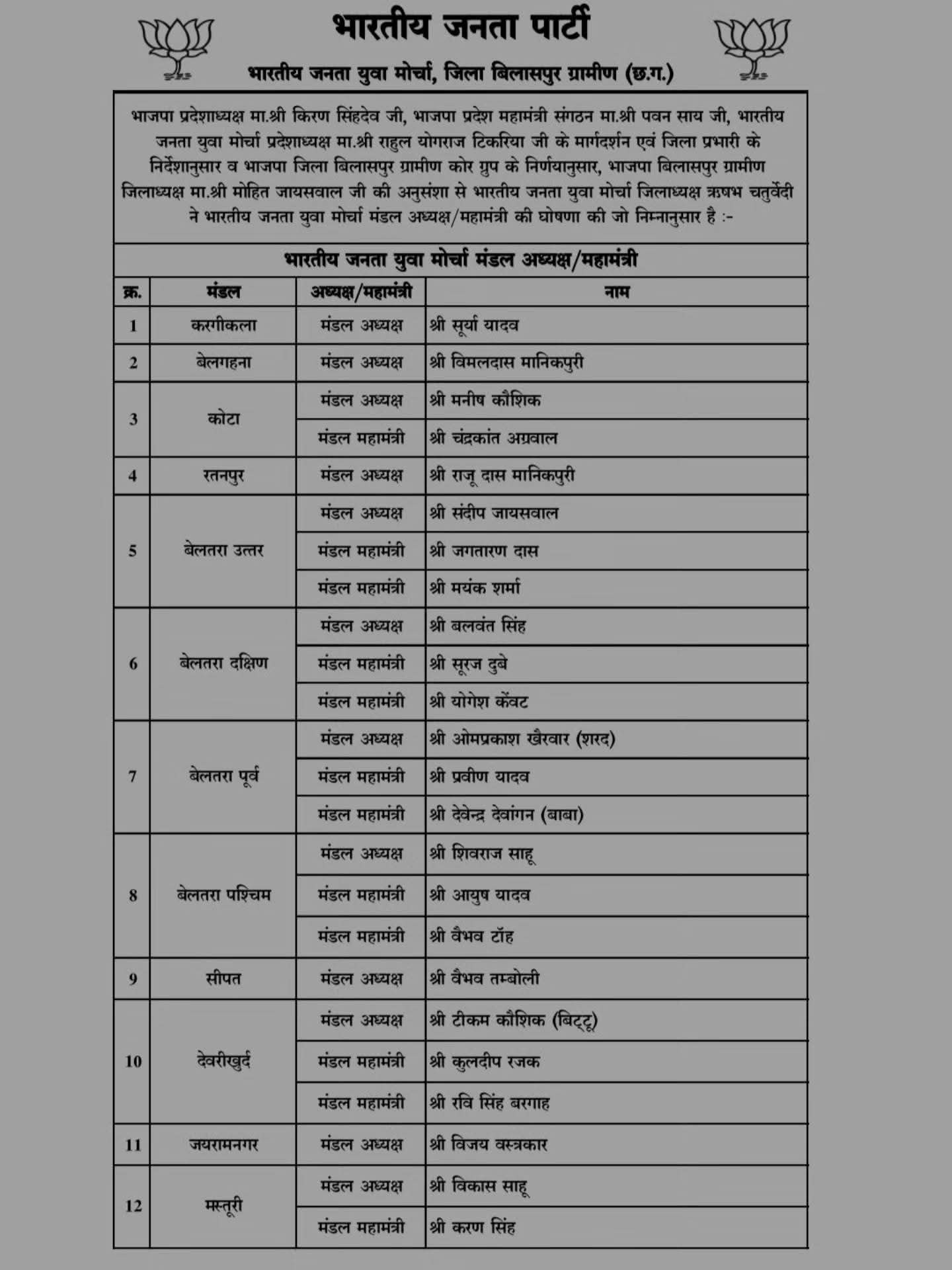 बिलासपुर। भारतीय जनता युवा मोर्चा (भाजयुमो) बिलासपुर जिला ग्रामीण (छत्तीसगढ़) की नई जिला कार्यकारिणी एवं पदाधिकारियों की सूची जारी कर दी गई है। संगठन द्वारा जारी सूची में विभिन्न पदों पर युवा कार्यकर्ताओं को जिम्मेदारी सौंपी गई है।