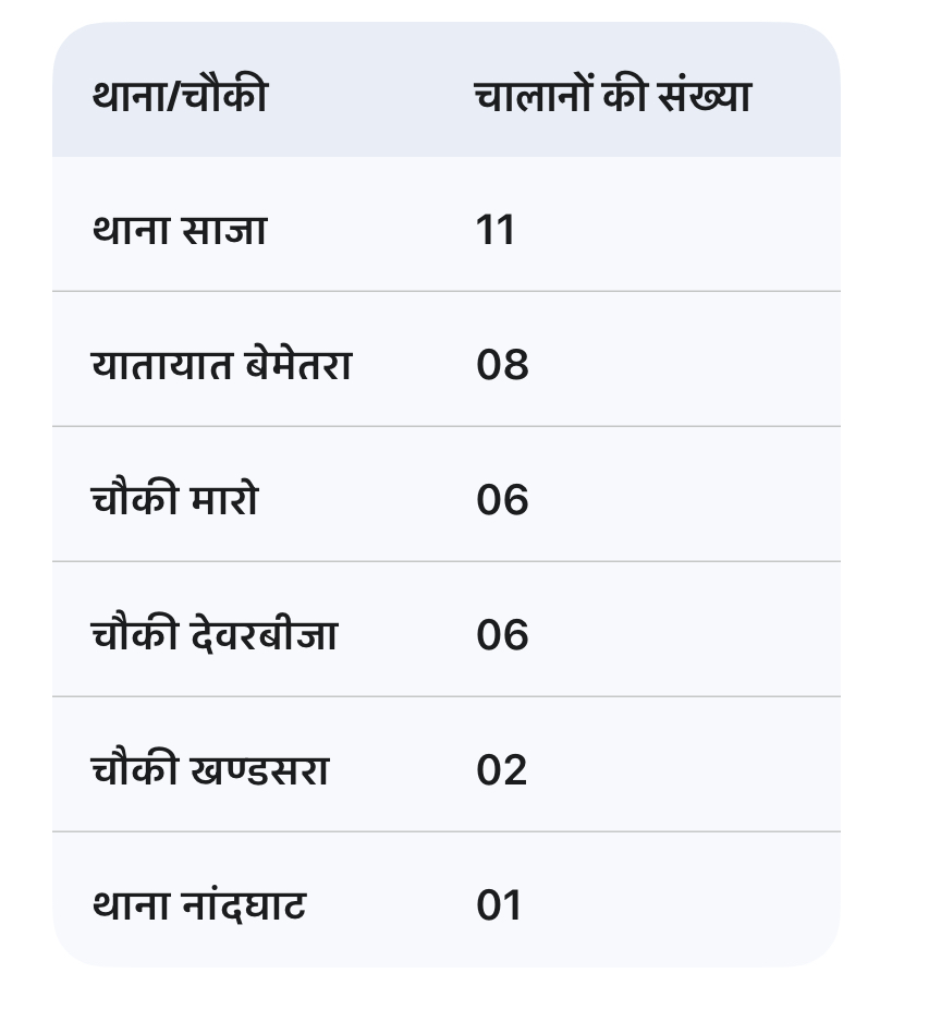 बेमेतरा पुलिस द्वारा मुख्य रूप से निम्नलिखित गंभीर उल्लंघनों पर कार्यवाही की जा रही है: