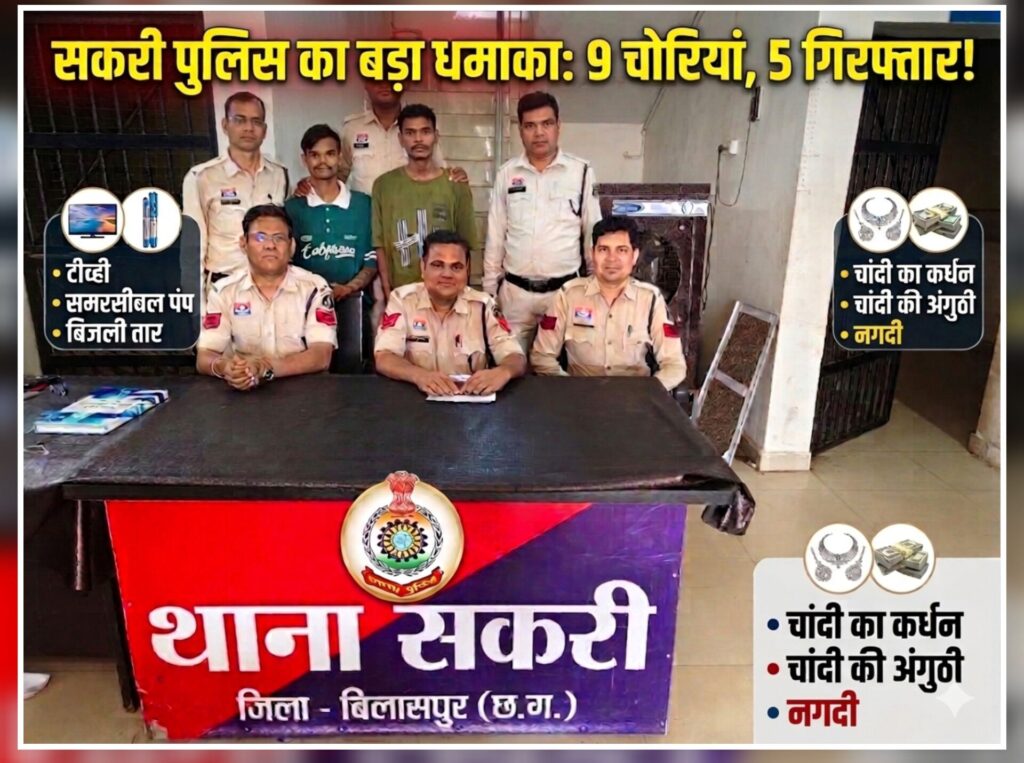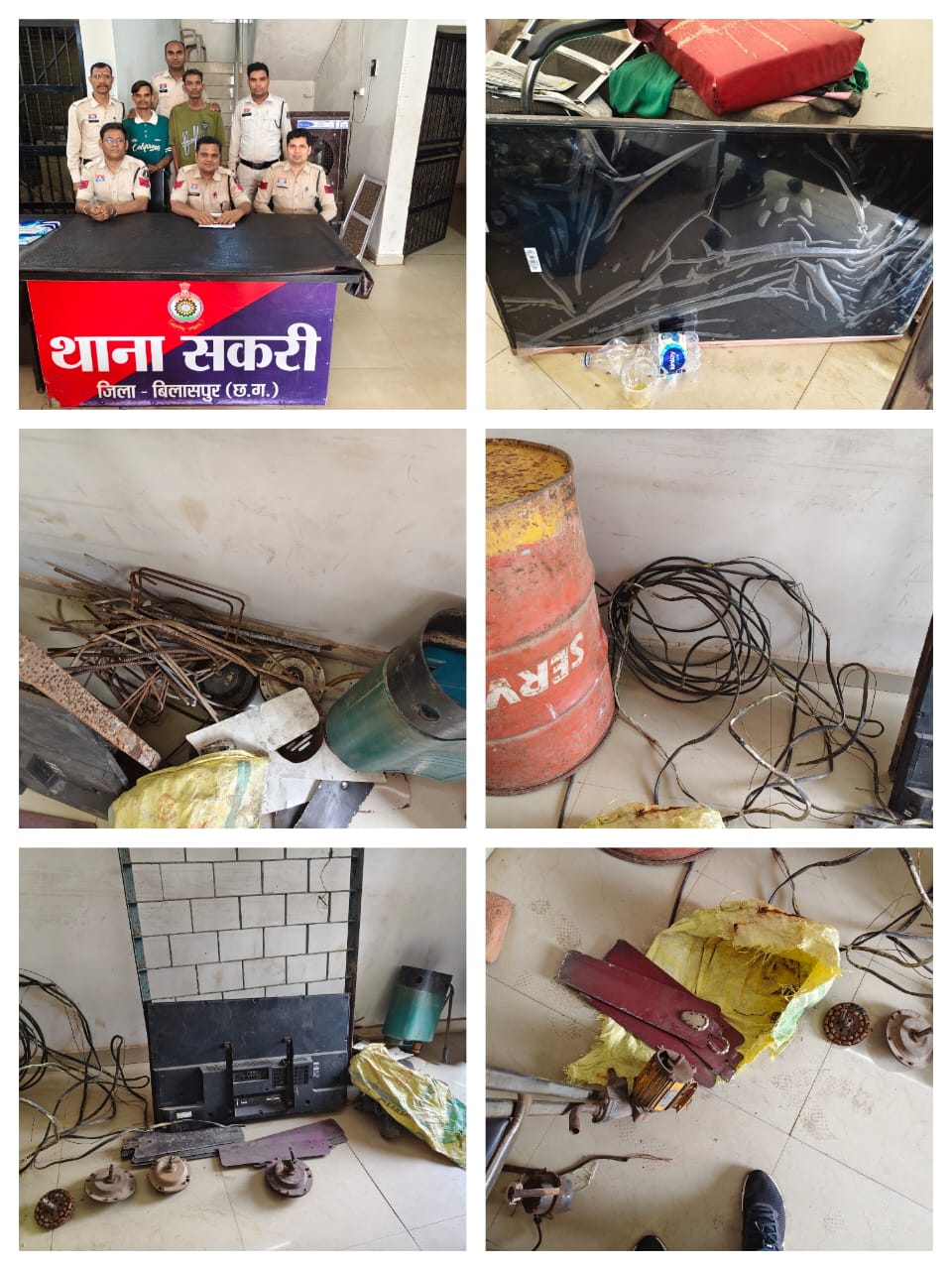 संदेह के आधार पर अरविंद पटेल (20 वर्ष) को हिरासत में लिया गया। शुरुआत में आरोपी पुलिस को गुमराह करता रहा, लेकिन कड़ी पूछताछ में उसने अपने साथी आशीष रजक (20 वर्ष) और तीन नाबालिगों के साथ मिलकर सकरी क्षेत्र के 9 अलग-अलग स्थानों पर चोरी करना स्वीकार किया।9 वारदातों का कबूलनामा: कहाँ-कहाँ की चोरी?पूछताछ में आरोपियों ने जनवरी से अप्रैल 2026 के बीच हुई निम्नलिखित चोरियों का खुलासा किया:चोरभट्टी खुर्द: प्लाट से समरसिबल पंप, ड्रम और स्पीयर पंप की चोरी।देवरीकला बस्ती: मकान का ताला तोड़कर 48 हजार की नकदी।आशियाना कॉलोनी (घुरू): निर्माणाधीन मकान से PVC पाइप और लोहे की खिड़कियां।बीज प्रशिक्षण केंद्र (चोरभट्टी): कॉपर और बिजली के तारों की चोरी।गिरधौना: रोड किनारे मकान से चांदी के जेवर और 10 हजार नगद।बंधवापारा व संबलपुरी: ताला तोड़कर टीवी, चांदी के बर्तन और भारी मात्रा में नकदी।सिद्धिविनायक कॉलोनी: सीलिंग फैन, स्टील के नल और कांसे के बर्तन।बरामद सामान (मशरूका)पुलिस ने आरोपियों की निशानदेही पर निम्नलिखित सामान जब्त किया है:01 समरसिबल पंप, 01 स्पीयर पंप।कॉपर तार, केबल और बिजली के वायर।चांदी की करधन, अंगूठी, पायल और चम्मच।एलईडी टीवी (TV), सीलिंग फैन, स्टील के नल।कांसे का लोटा और थाली।नकदी 700 रुपये (शेष राशि आरोपियों ने खर्च करना बताया)।इनकी रही सराहनीय भूमिकाइस सफल कार्रवाई में निरीक्षक विजय चौधरी, सउनि राजकुमार वस्त्रकार, प्रधान आरक्षक लक्ष्मीकांत कश्यप, रूपेश तिग्गा, चोलाराम पटेल, रवि कुमार लहरे, आरक्षक अफाक खान, आशीष शर्मा, पवन बंजारे और मनोज बघेल का विशेष योगदान रहा। सभी आरोपियों को गिरफ्तार कर न्यायिक रिमांड पर भेज दिया गया है।